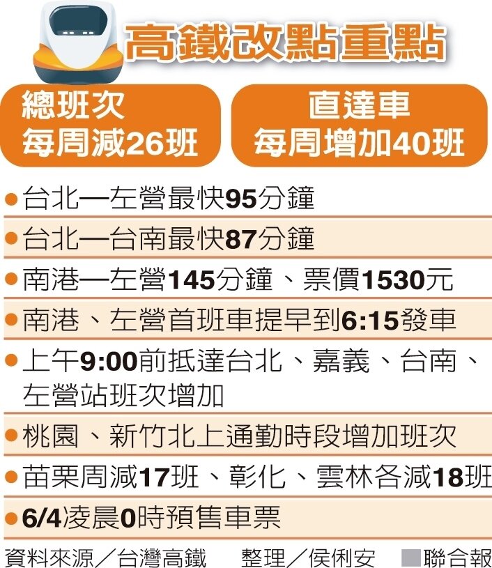 此外,這次新班表也洗刷台北到台南曾被稱為「台灣高鐵最遙遠的距離」的形容詞,原本台北到台南要九十五分鐘,班次也少,新班表將現有的半直達車,取消停靠嘉義站,讓北南首次出現八十七分鐘班次,並增開十五班。