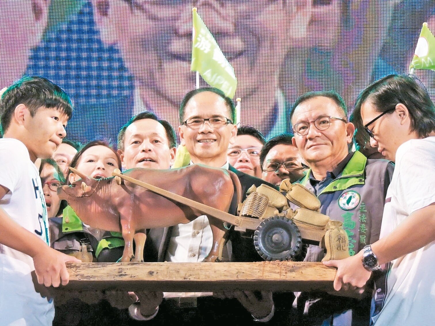 民進黨新北市長參選人游錫堃(中)昨晚成立競選總部並舉辦造勢晚會,支持者送上台灣水牛雕像,預祝他有如水牛耕耘,高票當選。