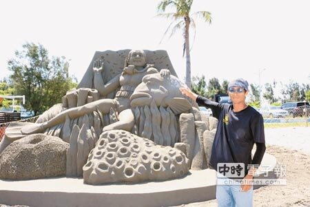 雲嘉南濱海國家風景區《一見雙雕藝術季》18日在將軍馬沙溝遊憩區開幕,沙雕創作者融入時事議題,創作行政院長林全穿著泳裝潛入海裡,要保護珍貴龍王雕的沙雕,成為開幕噱頭。