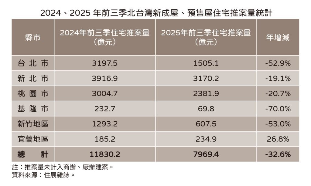 住展雜誌統計,北台灣今年前三季住宅類新成屋、預售屋總推案量約7969.4億元,年減3860.8億元,減幅32.6%,與去年前三季就已破兆元的順風順水情勢大相逕庭。