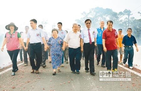 耗資近千萬元修建的中寮鄉龍安一號橋,16日舉行通車典禮,逾百位村民歡欣備妥豐盛供品,在開香剪綵儀式後,縣長林明溱、鄉長張永輝等人和地方耆老手牽手,緩緩走過該橋完成通車式。