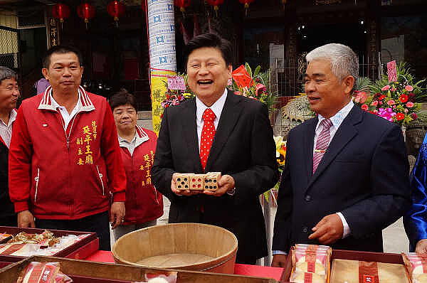 「手捧高高、一定ㄟ中狀元!」花蓮市延平王廟23日起舉行癸巳年國姓公聖誕「春到福到博成功」民俗走春系列活動,縣長傅崐萁、縣議員黃振富、花蓮市市長田智宣等人親自體驗「鄭家軍」軍旅文化-博狀元餅,在紀念國姓爺開台英雄偉大績業的同時,更歡迎鄉親到此體驗難得一見的傳統博戲文化。