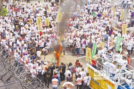 昨天上午民眾在安龍宮集結,舉牌「官逼民反」、「反對假民意」,年輕人徒步,老人騎摩托車,更老的搭遊覽車前往抗議。警方動員200多警力維持秩序,並在鄉公所、代表會圍起拒馬,但遊行隊伍自律不罵人、不製造糾紛、不丟垃圾,徒步1個多小時抵達公所後,高喊抗議蔡鄉長、尊重民意、拒設火葬場。
