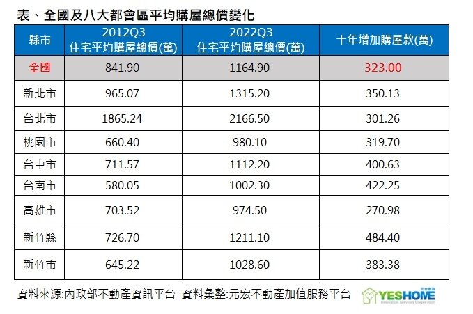 根據內政部不動產資訊平台數據顯示,2022年第3季全台平均購屋總價高達1164.9萬元,相較於2012年同期、10年前的841.9萬元大幅增加323萬元。進一步觀察較熱絡的都會區,則有3都會區10年來平均購屋總價增加超過400萬元,分別是台中400.63萬元、台南422.25萬元及新竹484.4萬元。