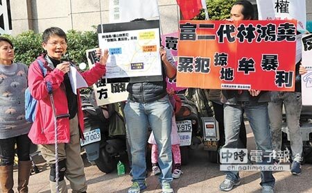 她認為,林鴻堯已是累犯,以各種鑽法律漏洞的詐術手法掠地搶地,讓房價居高不下,青年及弱勢住不起,「富到你,窮到我」,真是全民之禍,期盼檢察官能比照士林官邸人頭案予以起訴,並避免士林官邸案輕判12萬罰金,應從重量刑,以遏止累犯行徑。