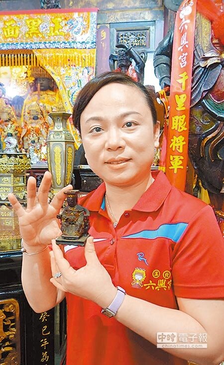 直到5年前擁200年歷史的六興宮誕生首位女性主委江筱芃,就任第一天到大殿監工時,突然一陣頭暈目眩,1尊掌心大小的媽祖現前,示意到廟內尋蹤,江筱芃表示,她立刻請人拿來掃把從倉儲深處勾出1只硬物,拿起來看居然是罕見的3吋身神明,由於雕刻非常精巧,擔心曝光後被偷,秉告媽祖暫居文物櫃中,擇時供上正殿。
