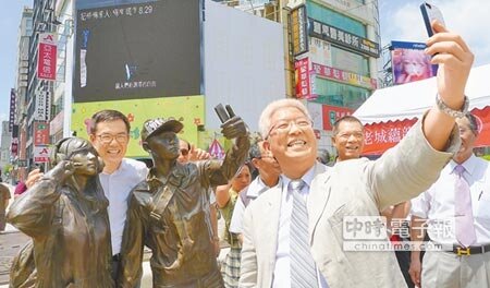 台北市副市長張金鶚(持手機者)與文化局長劉維公(左一)和「意在台北」銅雕開心自拍。(記者江慧珺/攝影)