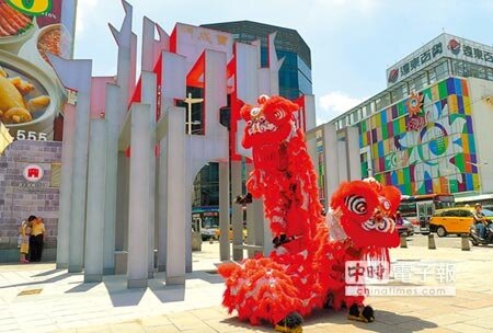 位於捷運西門站4號出口旁的「西門印象」裝置藝術昨啟用,邀請鴻勝醒獅團演出同慶。(記者江慧珺/攝影)