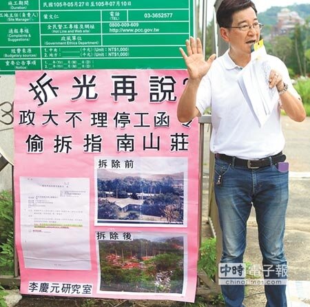 政治大學5月底開始拆除萬壽路上的指南山莊,附近居民不滿吵雜噪音和飛揚塵土,紛紛投訴1999;結果市府才發現工程未申請拆除執照,違法拆掉31棟舊房舍,昨更遭議員李慶元踢爆,即使日前北市建管處發文勒令停工,政大仍無視法令續拆。對此,政大主祕王文杰坦承疏失,已補辦程序備查。
