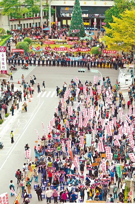 美麗灣案環評會場外,贊成與反對雙方壁壘分明,相隔一條馬路彼此叫陣。(黃力勉攝)
