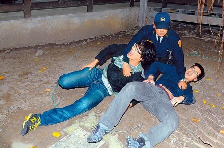 企圖從窗戶爬入旁聽的反美麗灣大學生,被警方壓制在地上。(莊哲權攝)