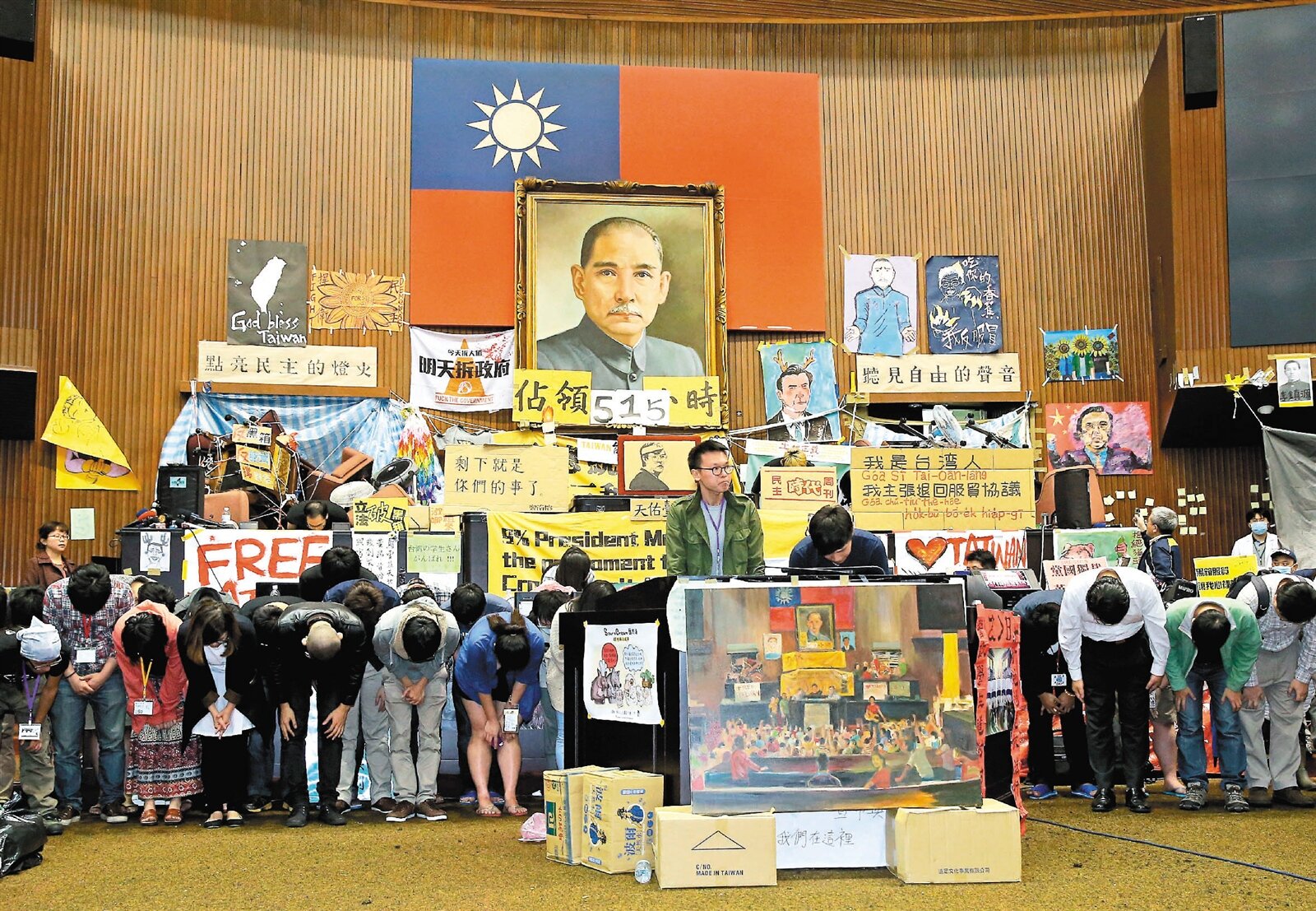 反服貿進入21天,學生總指揮陳為廷(中右)與林飛帆(中左)昨晚宣布完成階段性任務,將於後天退出議場,全體人員一起鞠躬感謝各界支持。(記者余承翰/攝影)