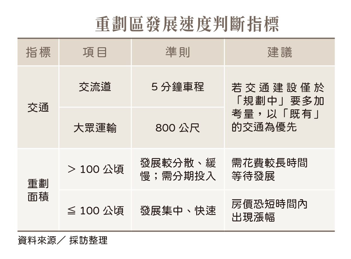 許多重劃區條件不差,卻因交通規劃遲未落地,導致發展裹足不前。根據本刊觀察,若開車五分鐘可達交流道、步行800公尺內有捷運站等大眾運輸系統,將有明顯優勢。反之,若交通系統仍停留在「紙上談兵」的評估階段,難以讓民眾建立信心,購屋與投資也會延後觀望,發展自然緩慢。