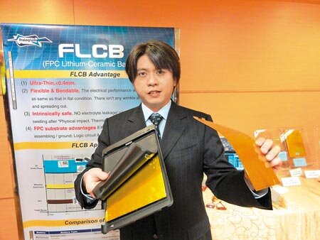 昨天記者會共有三家代表性公司參加,「輝能科技」公司的可撓曲鋰電池,薄度以公厘計算。總經理楊思木丹指出,採用軟性電路板為電池基材及封裝材,製作出可撓曲軟式鋰陶瓷電池,目前產品已整合到手機、平板電腦皮套內,可隨時隨地充電。他說,可撓曲電池不僅薄、可撓曲,甚至可直接剪開,也不會有漏液等危險,擁有世界多項專利認證。