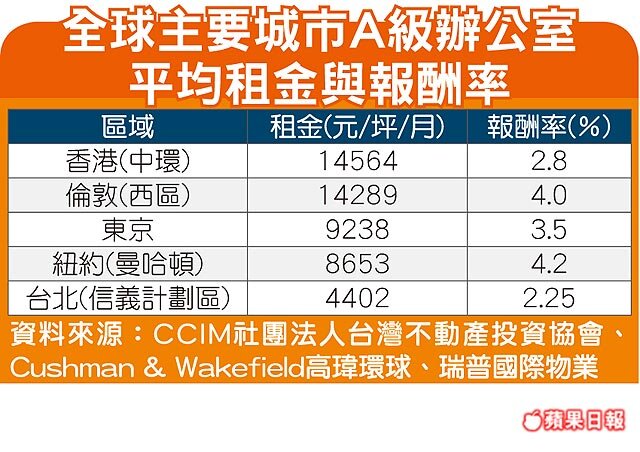 根據CCIM社團法人台灣不動產投資協會統計全球主要城市A級辦公室平均租金,台灣信義計劃區租金報酬率僅2.25%,在全球各大城市中墊底,目前以紐約曼哈頓報酬率達4.2%最高、倫敦4.0%居次,不過月租金行情則以每坪1萬4564元居冠。
