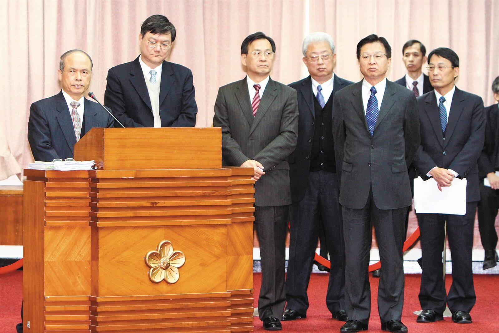 立法院財政委員會上午報告「國營事業績效獎金發放要點」,財政部長張盛和(左起)與經濟部次長杜紫軍、台電董事長黃重球、台電總經理朱文成、中油董事長林聖忠上台備詢。(記者鄭清元/攝影)