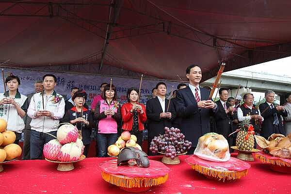 市長朱立倫、地政局長康秋桂、新莊區長許炳崑及市議員何淑峯、賴秋媚、黃林玲玲、陳科名、李倩萍、周雅玲等出席祝禱儀式。(記者黃村杉攝)
