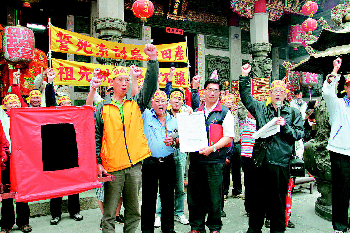 古寧頭南山村20多位村民上街抗議,並前往城隍廟遞交「申冤文」。 記者陳向鑫/攝影