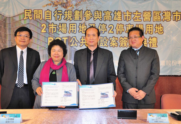 高雄市政府與皆豪集團持股100%子公司東暉企業股份有限公司,24日針對『高雄市左營區灣市2市場用地及停2停車場用地BOT公共建設案』進行簽約。高雄市長陳菊、經濟發展局局長曾文生等市府首長以及皆豪集團董事長曾國展許多貴賓,皆應邀出席這場盛會。本案基地坐落左營區華夏路與重和路口,灣市2市場用地(約1347坪)及停2停車場用地(約510坪),合併開發面積1,857坪,臨近高鐵、台鐵、捷運紅線左營共構站,位居北高雄重要的交通樞紐,乃休閒旅遊及商務旅客聚集之處。