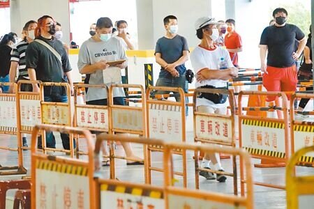 北市府15日針對環南市場有出現過確診者的漁產區、獸肉區及自治會等區塊匡列再做1次大規模PCR篩檢,估計要篩檢近4000人,不少攤商清晨就來排隊。圖/黃世麒攝