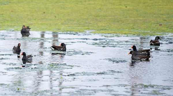 工作人員表示,紅冠水雞是農博基地內最常見的鳥類,之前約有70幾隻,在2、3月時,受不明人士的騷擾,目前只剩10餘隻,可能是人為驚擾,導致紅冠水雞移居他處,濕地的水草部分也被踏死,縣府呼籲民眾,共同維護這好不容易營造的生態環境。