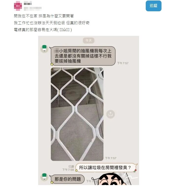 她指出,因為自身工作忙碌,也沒辦法天天倒垃圾,所以才會將排風扇打開,以免垃圾在房間內發臭,不料,房東則回覆「那是妳的問題」,並指出如果再沒關就要拔掉排風扇,讓她相當不能諒解。