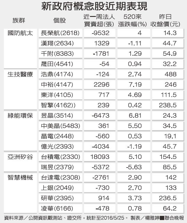 台股很給新政府面子,統計從519收盤8,095點,到昨日盤中最高8,417點,已經大漲了322點。法人表示,520後拉出一波慶祝行情,累計漲幅達3%,表現優於往年520行情。其中,與新政府相關的國防航太、生技醫療、綠能環保、亞洲矽谷與智慧機械等五大族群,普遍漲多於跌,而且不乏漲幅超越大盤的個股,反應市場對新政策仍充滿一定的期待。