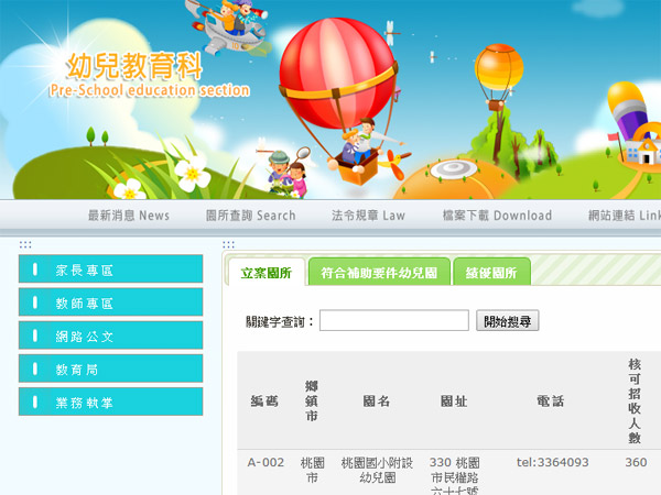 103學年度本縣持續於國小增設附設幼兒園10園以上。公立幼兒園的增設,增加本縣幼兒入公立幼兒園之機會,接受平價且優質之幼兒教育,以增加未來發展的潛能。尚有缺額幼兒園辦理4歲招生,預計全縣將有4000名以上缺額,家長可至桃園縣政府教育局幼兒教育科網站查詢尚有缺額幼兒園資料,並於5月20至22日逕至幼兒園登記。