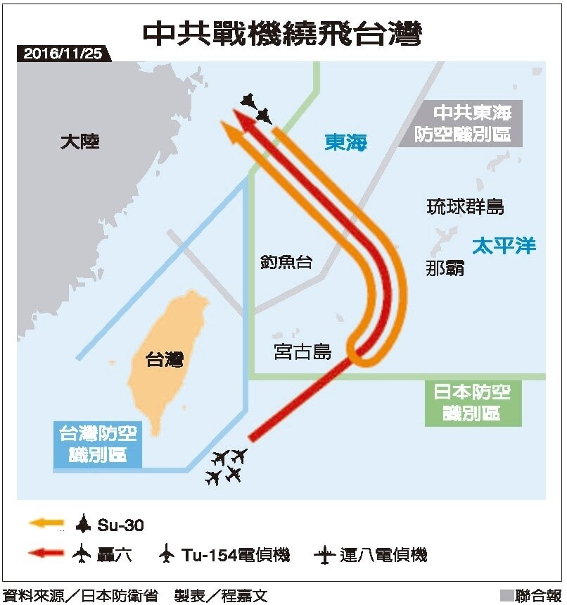 日本防衛省統合幕僚監部表示,兩架轟六轟炸機、一架圖一五四偵察機、一架運八偵察機等四架解放軍軍機廿五日在太平洋上空朝西北方飛行,飛越宮古海峽後往東海方向飛去。與此同時,兩架中方的蘇愷卅戰機與上述四架飛機反向飛行,通過海峽後折返,與前述四架飛機會合後一起飛往東海。