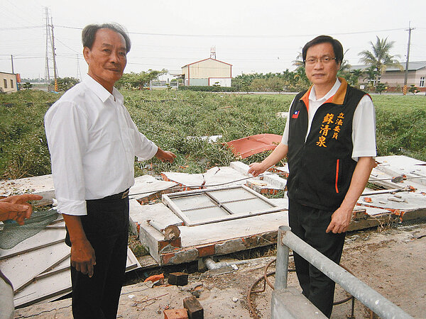 屏東縣籍立委蘇清泉(右)昨天會同萬丹鄉竹林村長張新寶(左),看到豬舍圍牆被怪風吹倒,感嘆氣旋的強勁。 (圖/陳崑福攝)