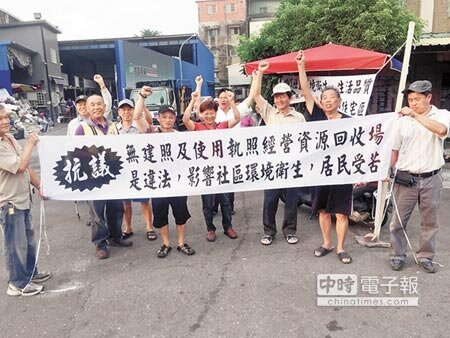 灣愛里民不滿回收場無照營業,甚至製造噪音、髒亂,6日拉白布條抗議「快遷廠」。