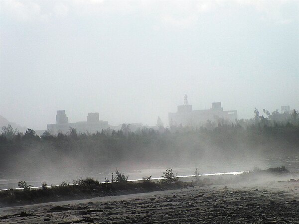 台東縣政府原本在卑南溪下游築起防砂水塘及開放種植西瓜田,最近因接連颱風所毀,縣府雖已調派怪手修復水塘,出動灑水車在河床來回灑水;八河川局在中華大橋2側架設的17支自動噴水槍也全數開啟,噴水形成水幕,低空攔截風飛砂,但依然不敵強勁風勢,台東市仍霧茫茫。