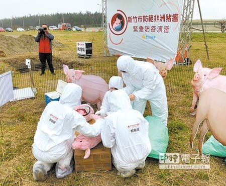 為全面防範非洲豬瘟,新竹市政府11日上午於南寮漁港舉辦跨單位的「非洲豬瘟緊急防疫模擬演習」,就發現豬瘟疫情、通報且確診、挖洞焚燒並掩埋等標準作業程序進行操演,要全力將非洲豬瘟阻絕境外。