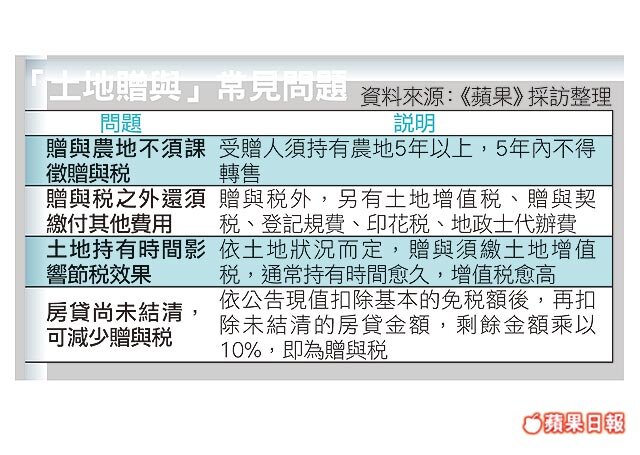 永慶房屋契約部經理陳俊宏指出,每人每年僅220萬元的免稅額,超過此額度的贈與建物、土地面積可以切割持分的方式逐年移轉至子女名下。舉例來說,房屋公告現值為500萬元,但若將房屋分成2年贈與,原本的500萬元切割成1年250萬元,扣除220萬元的免稅額後,當年剩餘30萬元乘以10%,每年只要繳3萬元的贈與稅。