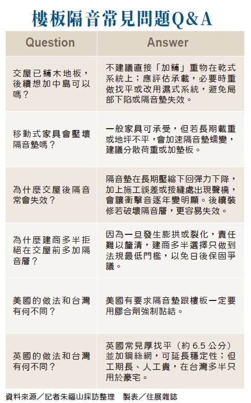 哲空間室內裝修設計總監吳宜哲就指出,他有客戶希望在樓地板多加一層隔音墊,但建商多半不願意配合,原因是,「一旦交屋後發生膨拱或裂化,責任難以釐清」。