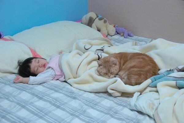 漸漸地,貓咪們都適應孩子的存在,其中年紀最大的貓「小笨」會陪女兒睡覺;當女兒一哭,最小的貓咪「Rainbow」還會湊上去看看發生了什麼事,甚至會磨蹭她,彷彿是在療癒與安慰。李小飛也經常教導女兒對待貓咪的力道,從小做好生命教育。
