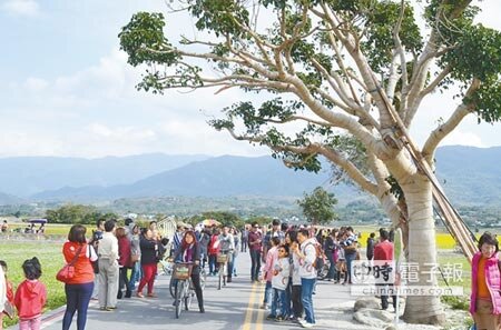 連假期間台東最受歡迎的景點莫過於伯朗大道及金城武樹,3日仍湧進萬人,由於當地禁行汽車,多數遊客都租單車或徒步,人潮將伯朗大道擠得水洩不通。