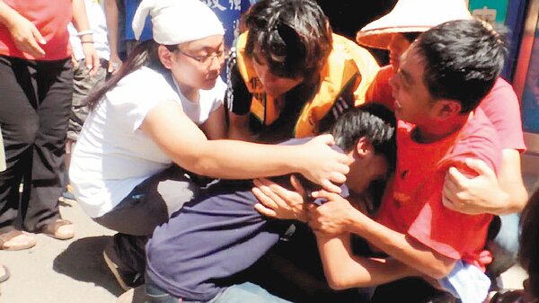 苗栗大埔拒拆戶張森文和兒子擔心家園不保,相擁跪地痛哭。(記者祁容玉/攝影)