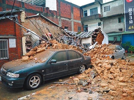 十年的嫁妝飛了!中壢市環北路一幢八十年磚造平房,九日突然崩塌,壓壞兩輛轎車,其中一台還是劉小姐的嫁妝,所幸無人傷亡。屋主與車主是多年好鄰居,將先移除大量土塊後再談後續賠償事宜。