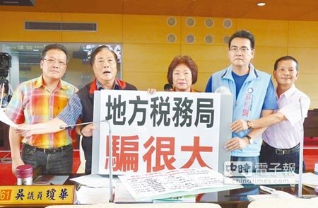 藍營市議員陳成添、楊正中、羅永珍、蘇柏興、賴朝國(由左至右)等人,昨日為工廠業者請命!(陳世宗攝)
