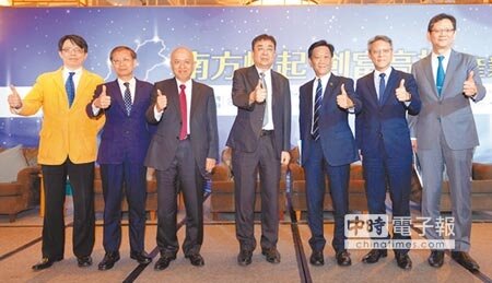 由工商時報主辦的「南方崛起,創富高雄」產業論壇14日舉行。第三場策略對談邀請到台灣智慧綠能產業聯盟理事長陳仁達(圖左起)、中鋼公司執行副總王錫欽、台新銀行文化藝術基金會董事長鄭家鐘、高雄市經發局長伏和中、工商時報社長陳國瑋、資誠聯合會計事務所所長周建宏、資誠南高所長劉子猛等出席共談。圖/王德為