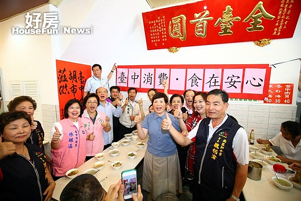 胡市長今日來到這家位於火車站附近的肉圓老店「台中肉員」,為老闆周朝堂加油打氣。他與民政局長王秋冬、新聞局長石靜文、議員何敏誠、邱素貞、李中、林珮涵等一起高喊「台中消費,食在安心」,並當場吃起肉圓,希望喚起消費者的信心。