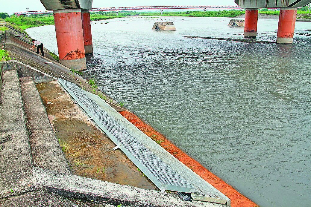 自來水公司第八區管理處在宜蘭羅東溪攔河堰的表面水取水口(圖中鐵柵門處)已經封閉。(記者羅建旺/攝影)