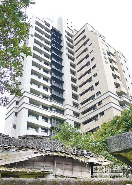 老屋求新生「前南菜園日式宿舍」建築群坐落於精華地段,但長年未經修復顯得荒廢,與後方將完工的豪宅形成強烈對比。(記者江慧珺/攝影)