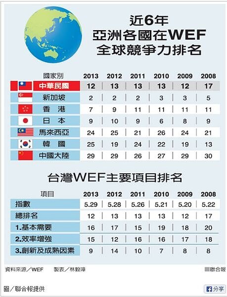 世界經濟論壇(WEF)昨天公布最新「全球競爭力報告」,瑞士蟬聯5年榜首,美國名次進步至第5,台灣的全球競爭力前進至第12名,南韓退至第25名。(翻攝自聯合報)