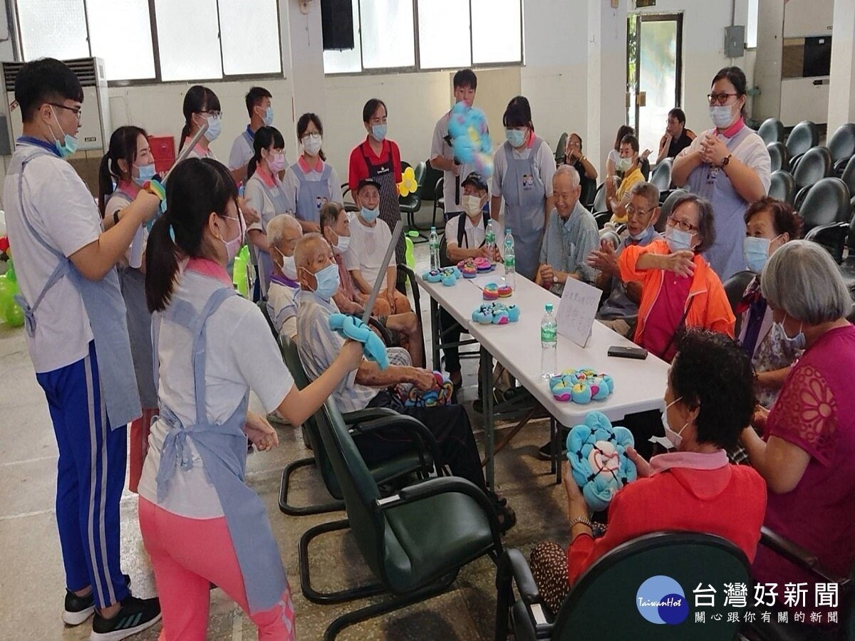 活動前運用課堂所學氣球裝置藝術,折出美麗的花朵布置場地,並以「襪子」為主題,準備了精彩紛呈的節目,首先帶來律動教學,讓長輩運用簡單工具隨時做運動,接著同學們牽著爺爺奶奶的手一起由大到小堆疊襪子甜甜圈,過程中雖不慎倒下,但長輩們不氣餒,在學生的鼓勵下順利完成,開心之情溢於言表。