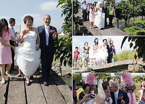 大忠村的游清山〔83歲〕、游陳玉梅,結婚61載,臉上堆滿了笑容走過石板橋,還應眾人要求當場接吻,接受歡呼與祝福。游陳玉梅表示,這是她第一次穿婚紗,實在很高興。