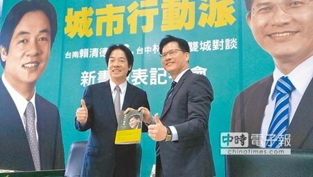 民進黨台中市長參選人林佳龍(右),昨天發表新書《城市行動派》,邀請台南市長賴清德對談。