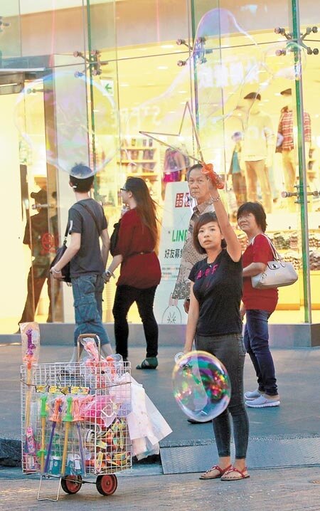 賣力賺錢主計總處公布8月失業率為4.33%,20到24歲族群達14.77%,創1年多來新高!而人力銀行調查,第4季開始,企業徵才明顯增加。圖為在西門町鬧區裡,一位女子推著小攤車,拿著泡泡棒揮出大泡泡來吸引遊客目光。(記者陳麒全/攝影)