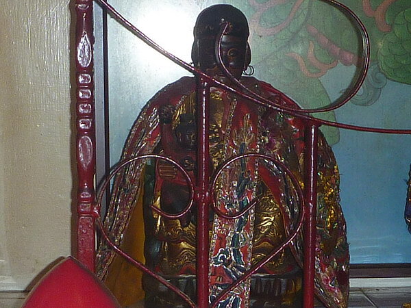 石岡區九房里山下巷福德祠,罕見供奉抱子土地婆金身。(記者黃玉鼎攝)